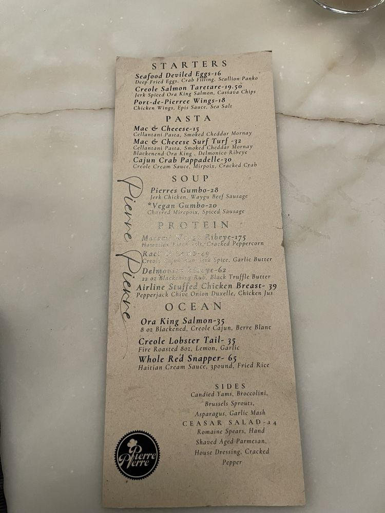 Welcome to Pierre Pierre, a Cajun/Creole steakhouse located in Oakland, CA. With a diverse menu that includes Pescatarian and Vegan options, Pierre Pierre caters to a wide range of dietary preferences. The restaurant offers amenities such as wheelchair accessibility, outdoor seating, and free Wi-Fi, making it a convenient and comfortable dining experience. Additionally, Pierre Pierre is Black-owned and strives to create a welcoming atmosphere for all patrons. From the flavorful Cajun dishes to the top-notch service, Pierre Pierre stands out as a must-visit spot for a memorable dining experience in Oakland. Don't miss out on their happy hour specials, full bar, and private dining options. Experience the best of Cajun and Creole flavors at Pierre Pierre.